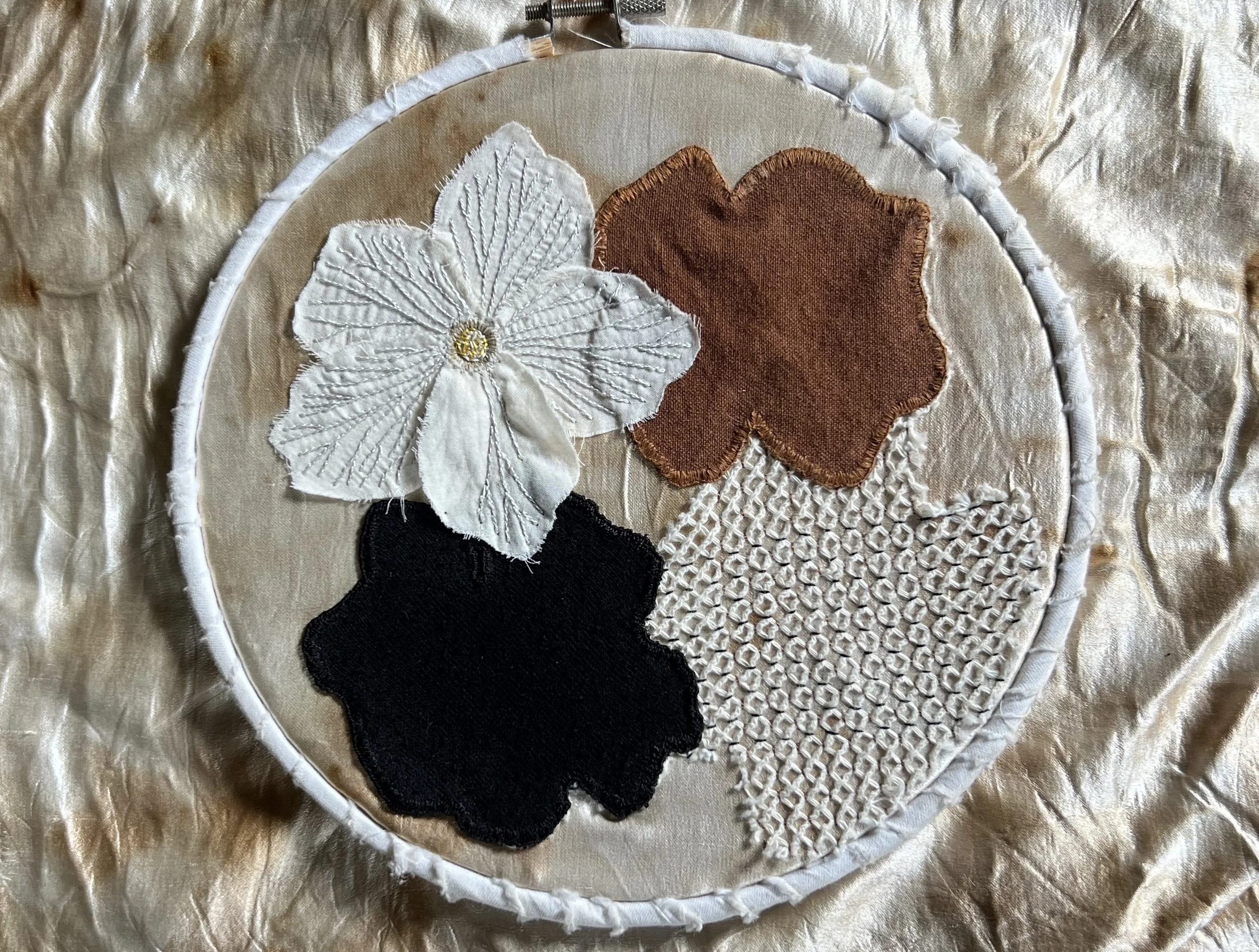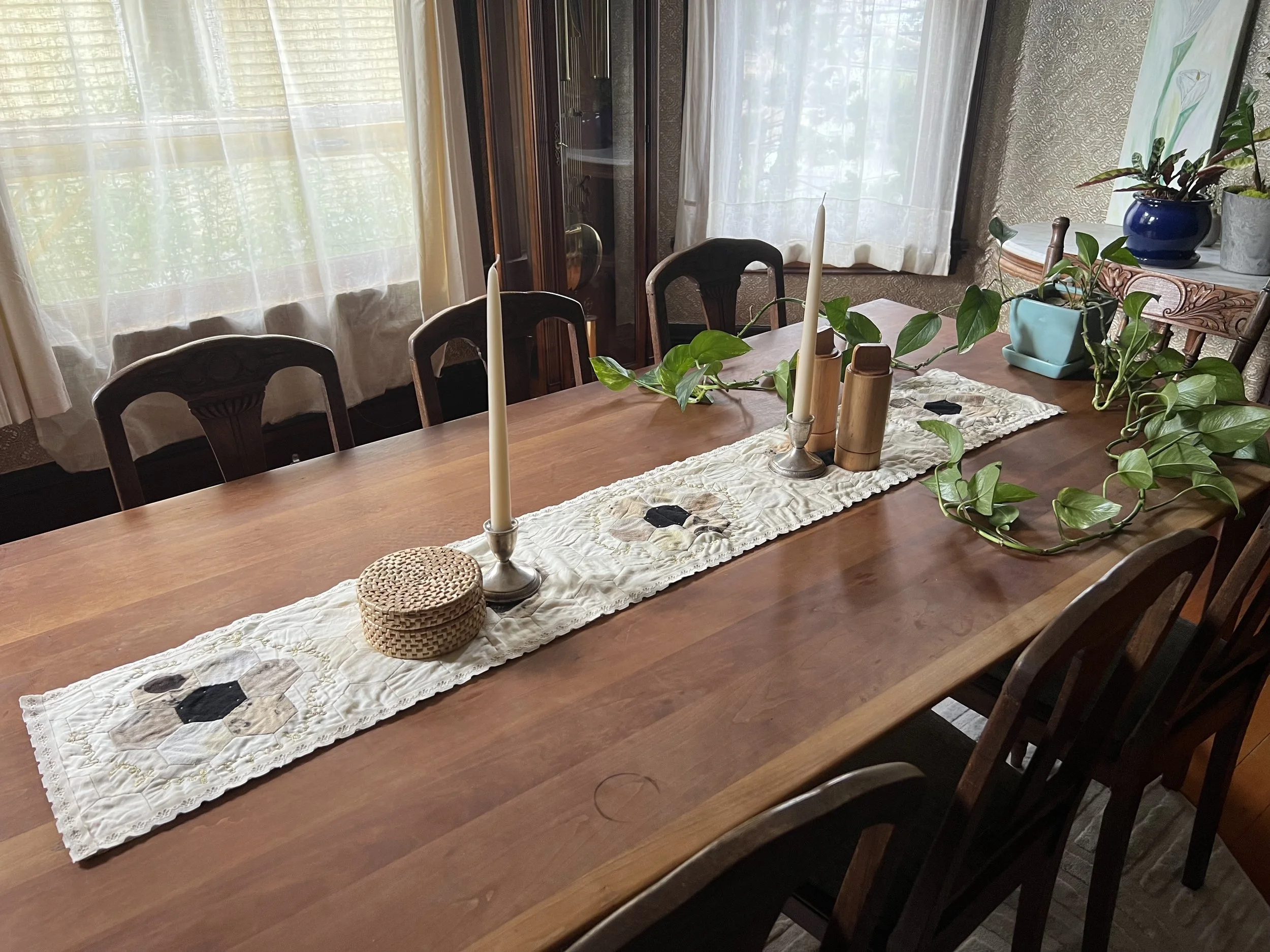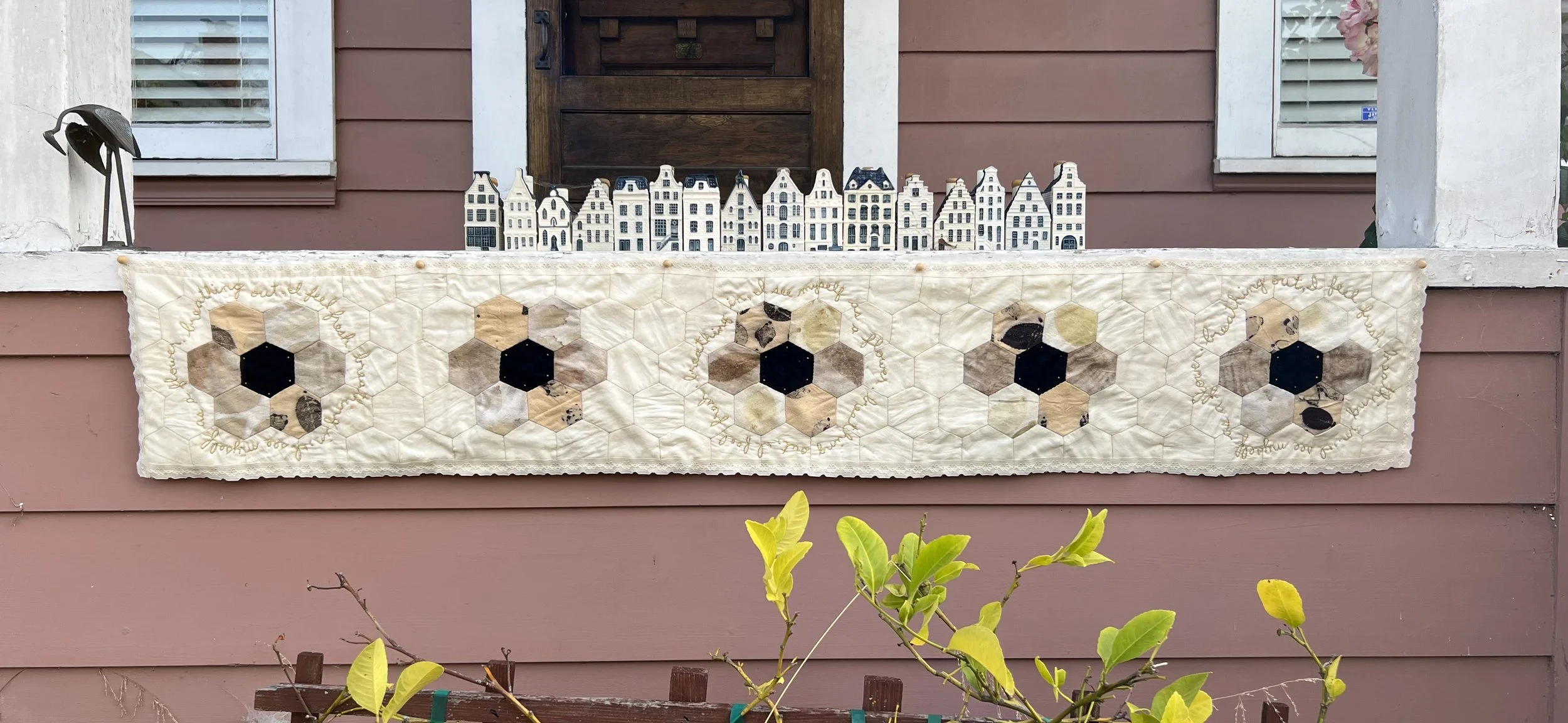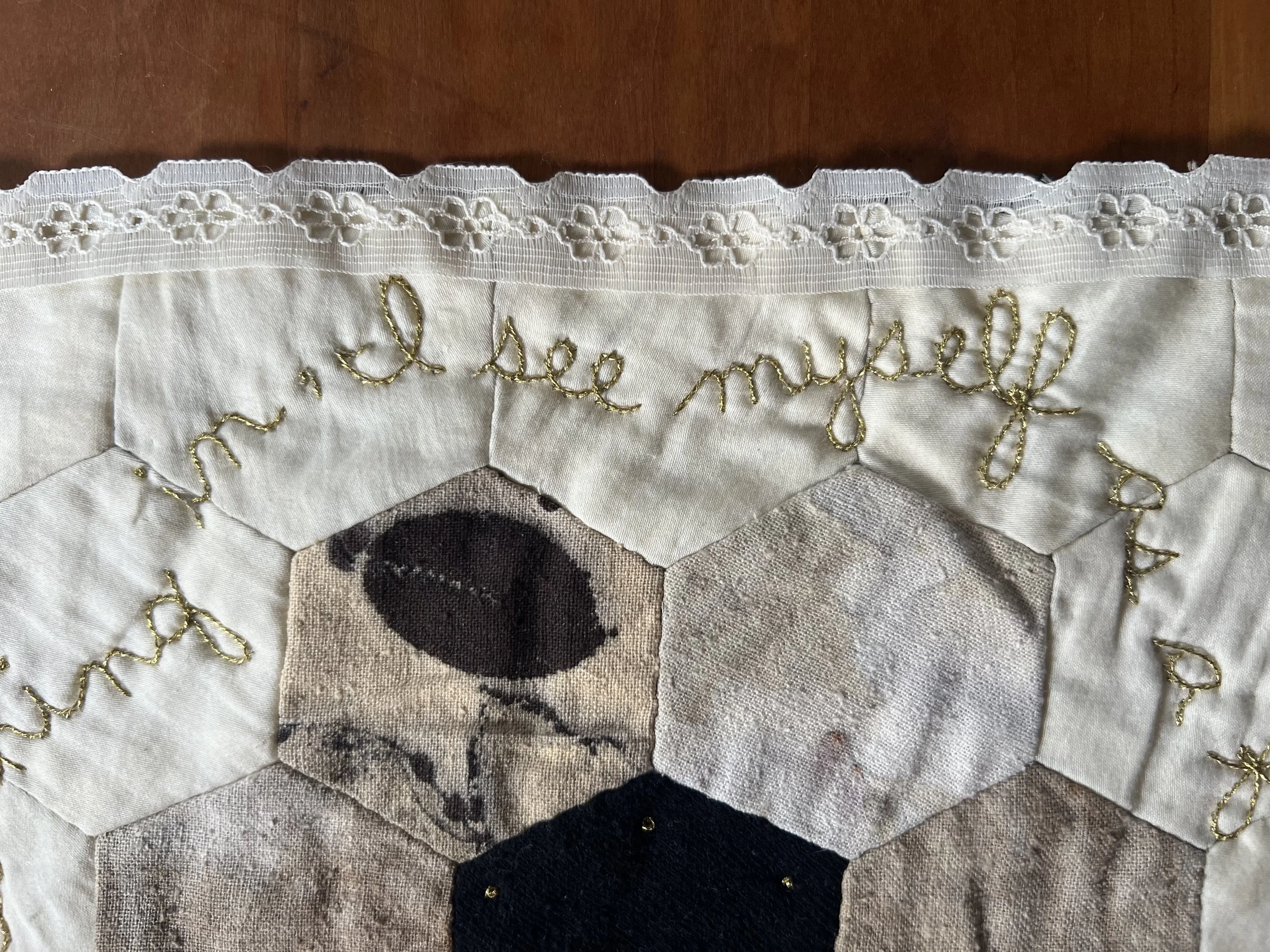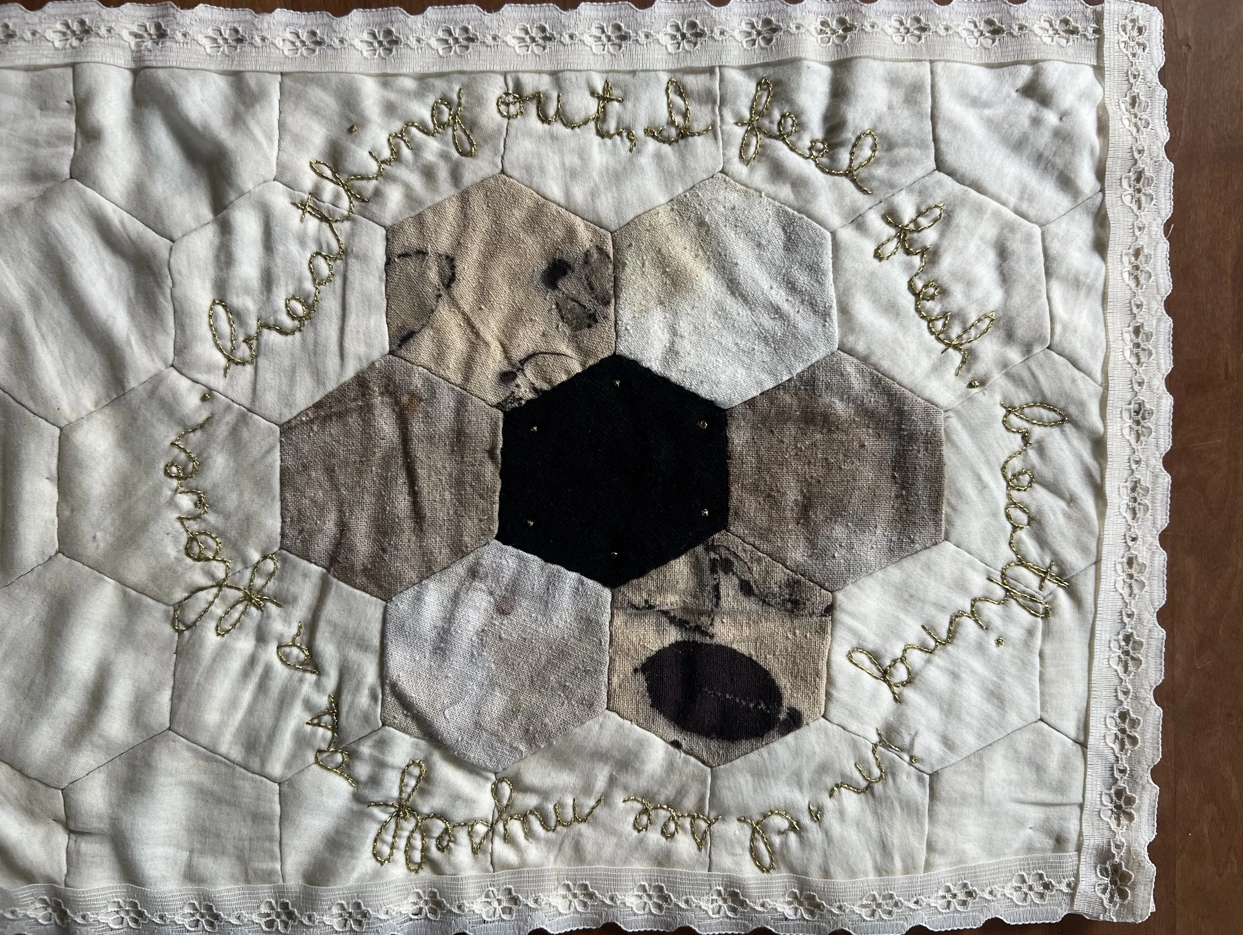 Created over the course of a year, this hand-pieced and embroidered hexagon quilt was developed through a confluence of communal textile practices and floral knowledge gathered across multiple learning contexts. Drawing on a mail-based textile exchange conducted during the COVID-19 pandemic and earlier training in botanical stitching and natural dyeing in eastern Tennessee, the work assembles contributions, techniques, and materials from many hands and geographies.