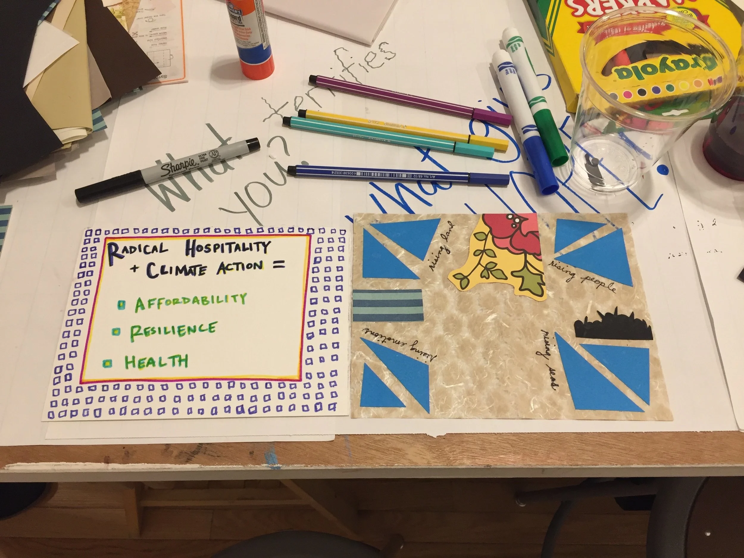 Images (from the left): Climate Coven event at Practice Space, December 2019; artistic responses to the prompt, “How can we practice radical hospitality?”; Climate Coven, 2019, collaborative digital collage.