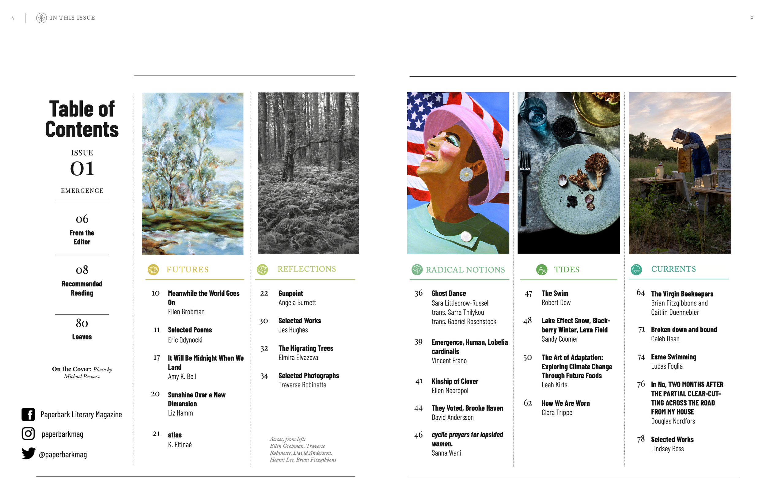 Images (clockwise from top left): Hearts in Action gathering, 2017; installation by artist Phyllis Labanowski as part of a water appreciation ritual and reflection with Hearts in Action participants that also included learning about our local waterways and drinking water system; Paperbark Issue 1: Emergence table of contents. Paperbark has now published five print issues which are available to view digitally via open access here.