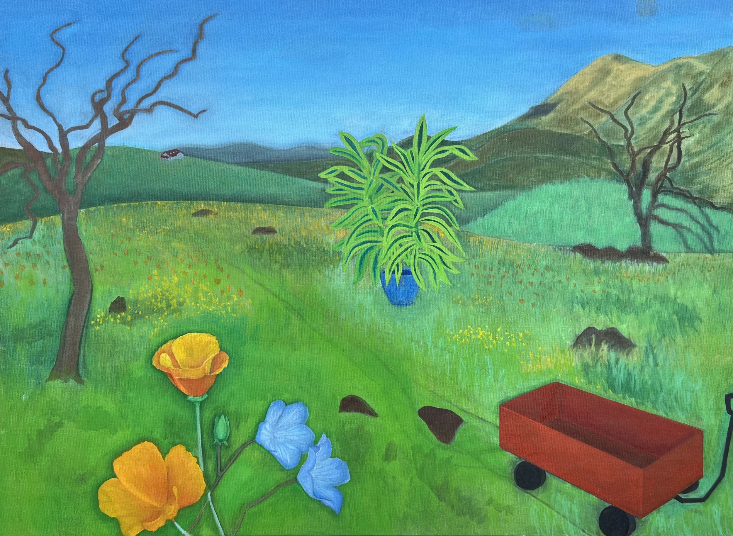 Working in series allows me to test how shifts in scale, composition, and setting alter the perceived agency of plant forms and the social meanings attached to them. Painting functions here as a method of slow observation and material inquiry, offering a counterpoint to my participatory work by foregrounding attention, duration, and looking as forms of ecological practice. These works remain in progress as I continue to explore how painterly strategies might articulate relationships between land use, domestic labor, and care without relying on extractive or romanticized landscape conventions.